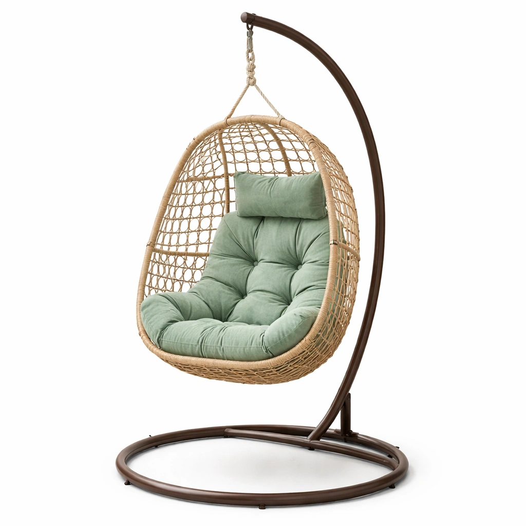 Silla colgante de ratán y acero con cojín verde